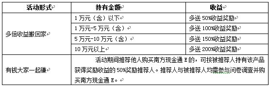 【活动形式】:以问卷调查方式开展,客户参与答卷即可获得收益翻倍权,购买南方现金通E,获取多倍收益奖励;推荐他人参与活动,还可享受奖励收益。活动结束后5个工作日,以南方现金通E基金份额的形式兑付。