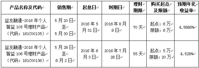 智益106号理财产品于2016年5月28日9:00发售,单个客户累计认购上限20万(含)元整。该产品额度总计3亿元,发售首日释放2亿元,剩余额度将于5月30日9:00释放。