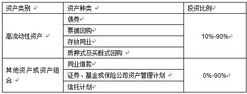 本理财计划资金由河北银行投资于以下符合监管要求的各项资产:一是高流动性金融工具,包括但不限于存放同业、银行间市场质押式回购、票据回购、较高信用等级债券;二是其他资产或资产组合,包括但不限于租赁回购、证券、基金或保险公司资产管理计划、信托计划等。本产品投资的资产种类和比例如下,可在[-10%,+10%]的区间内浮动: