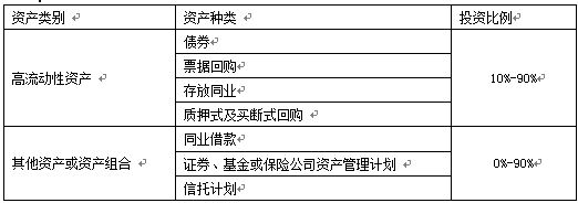 本理财计划资金由河北银行投资于以下符合监管要求的各项资产:一是高流动性金融工具,包括但不限于存放同业、银行间市场质押式回购、票据回购、较高信用等级债券;二是其他资产或资产组合,包括但不限于租赁回购、证券、基金或保险公司资产管理计划、信托计划等。本产品投资的资产种类和比例如下,可在[-10%,+10%]的区间内浮动:
