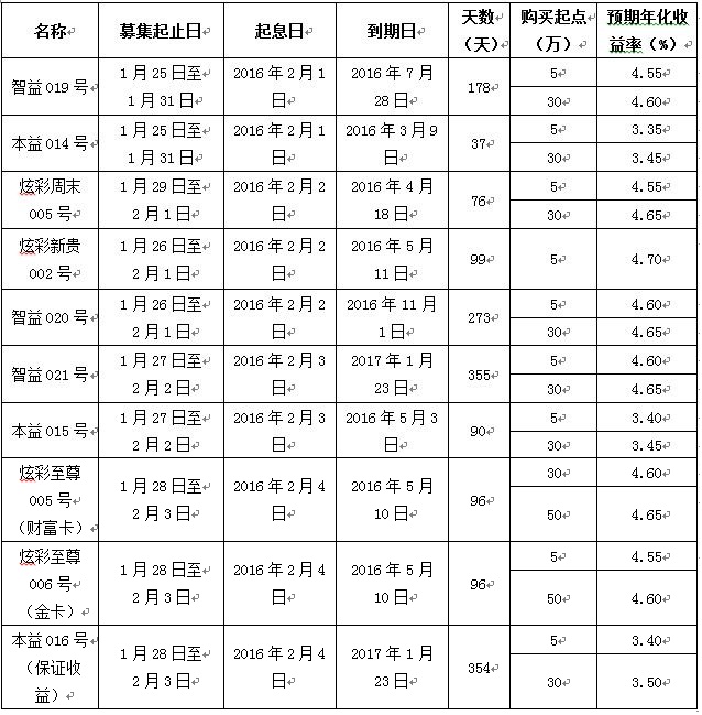 2016年1月25日至2月3日我行将陆续发行10款理财产品,具体发售明细如下: